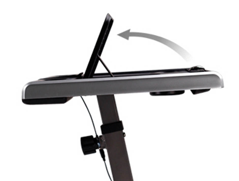Eine absolute Neuheit in der Welt der Heimtrainer: Er ist der erste und einzige auf dem Markt, der nebeneinem einfachen Zugang und einem patentierten Mehrfachverstellsystem einen echten ergonomischen Schreibtisch bietet, an dem Sie während des Trainings am Computer arbeiten können, ohne auf die Trainingsinformationen des integrierten Computers und den platzsparenden Klappmechanismus verzichten zu müssen.