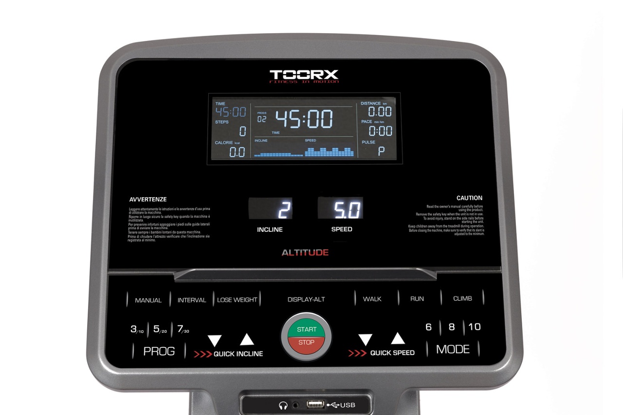 Leistungsstarkes und vielseitiges Laufband der Marke Toorx, ausgestattet sowohl mit dem Modus RUN (Geschwindigkeit von 0,8 bis 18 km/h und Steigung von -2 % bis +15 %) als auch mit dem Modus CLIMB (Geschwindigkeit von 0,8 bis 6 km/h und Steigung von -2 % bis +36 %), um ein Trainingserlebnis zu gewährleisten, das den Bedürfnissen jedes Sportlers gerecht wird.