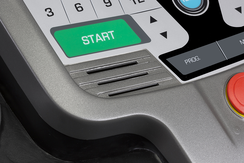 Geschwindigkeit – Steigung – Herzfrequenz – Distanz – Zeit – Kalorienverbrauch – laufendes Programm |