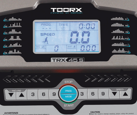 Geschwindigkeit Neigung - Herzfrequenz - Entfernung - Zeit - Kalorienverbrauch - laufendes Programm |