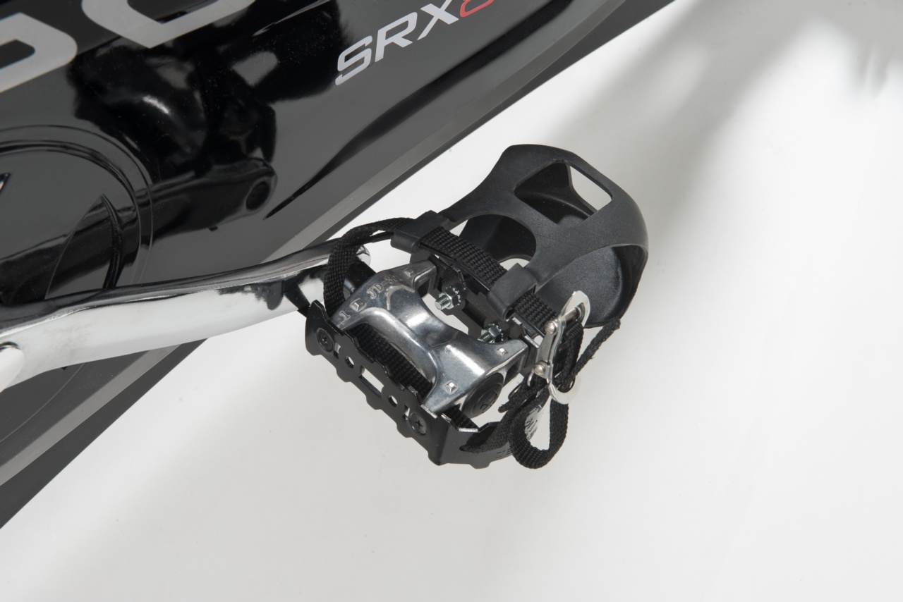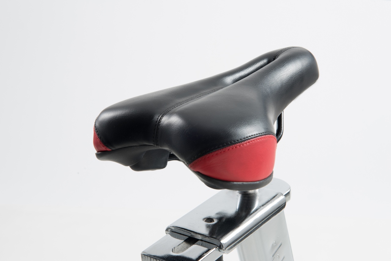 Transmisión por correa con piñón fijo. Sistema de frenado por amortiguación con fieltros. Palanca de seguridad para el bloqueo rápido del volante. Masa del volante de 24 kg, mecanizada con CNC y equilibrada. Receptor inalámbrico integrado y banda de cardio incluida.
