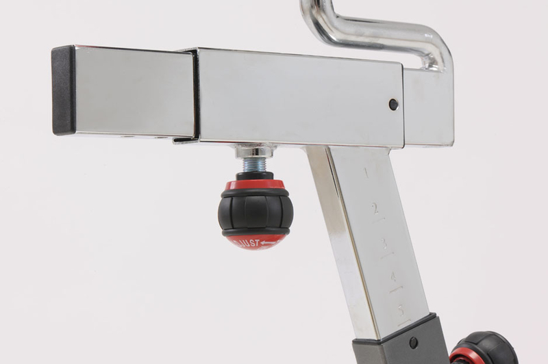 Transmission par chaîne avec pignon fixe. Système de freinage à patins avec feutres. Équipé d'un levier de sécurité pour le blocage rapide du volant. Masse du volant : 20 kg (équilibré). Hand pulse.