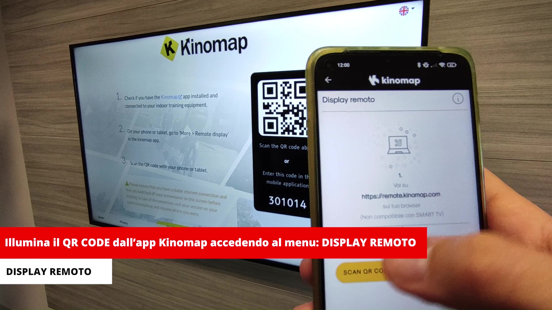 Apri un browser (chrome o firefox o altri compatibili), e digita l'indirizzo https://remote.kinomap.com , la pagina si aprirà mostrando un QR CODE ed un codice. Apri l'app Kinomap sul tuo smartphone/tablet , premi sull'icona menu in alto a destra e premi Display Remoto. Clicca su Scan QR CODE ed illunima il QR (in alternativa puoi inserire il codice numerico).