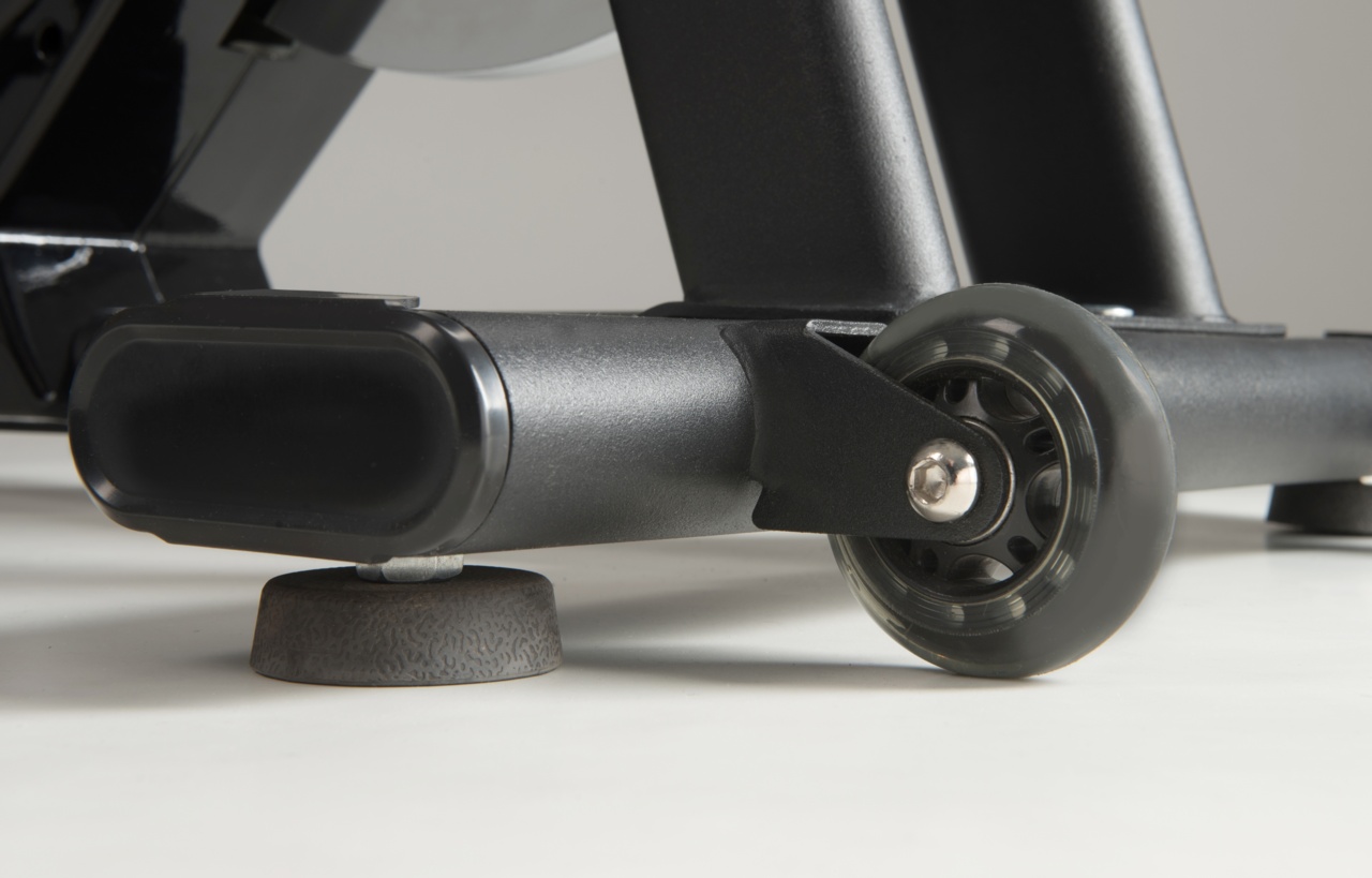 Przekładnia pasowa ze stałą zębatką. Magnetyczny system hamulcowy z elektroniczną regulacją siły hamowania i hamulcem bezpieczeństwa. Wyposażony w dźwignię bezpieczeństwa do szybkiego blokowania koła zamachowego. Masa koła zamachowego 24 kg, obrabiana CNC i wyważana. HRC-HEART RATE CONTROL. Zintegrowany odbiornik bezprzewodowy i pasek cardio w zestawie. APP READY. iConsole+App (w zestawie). Kinomap Fitness App (kompatybilna).