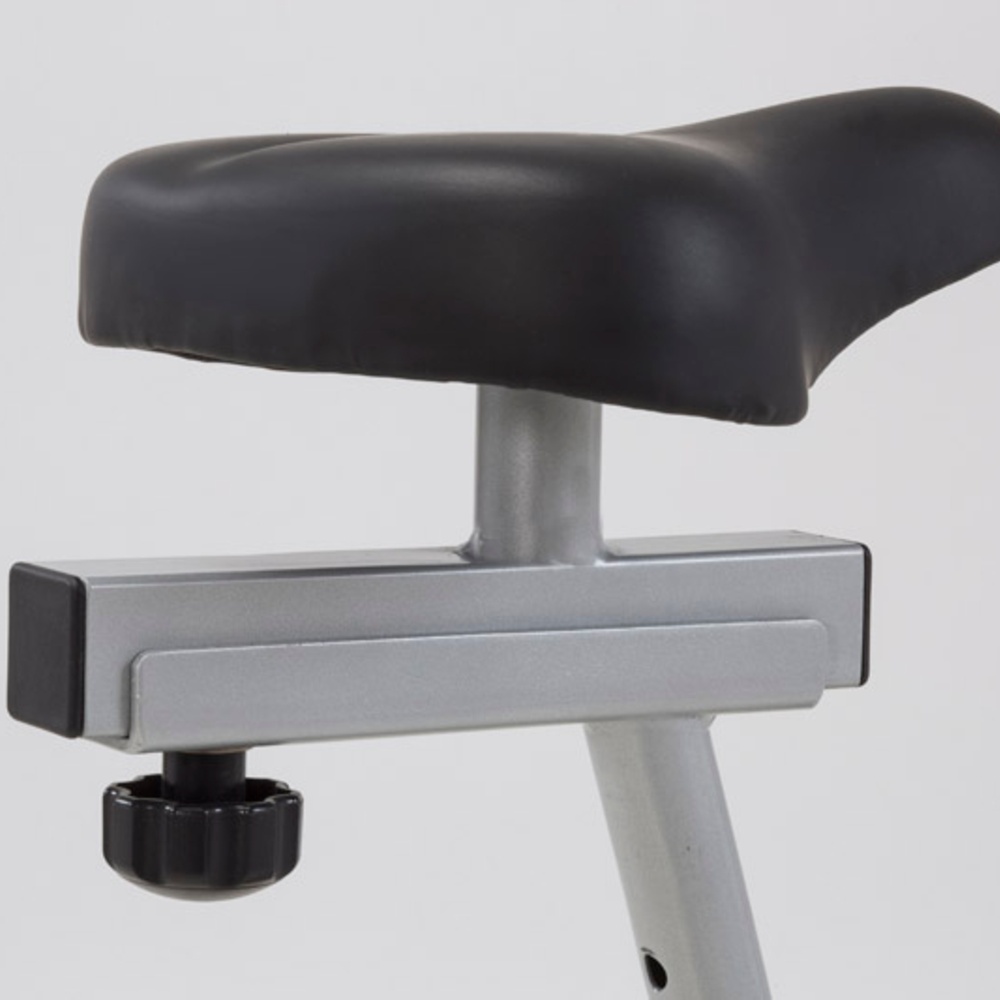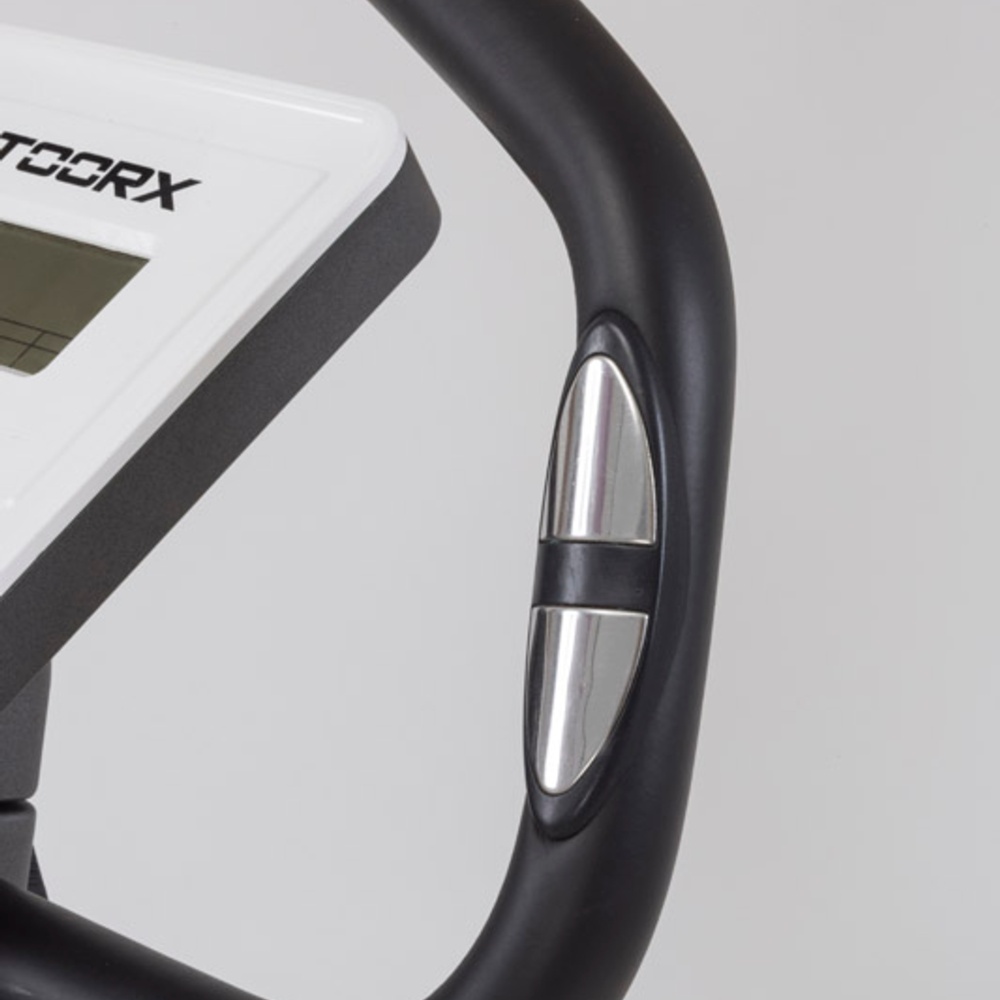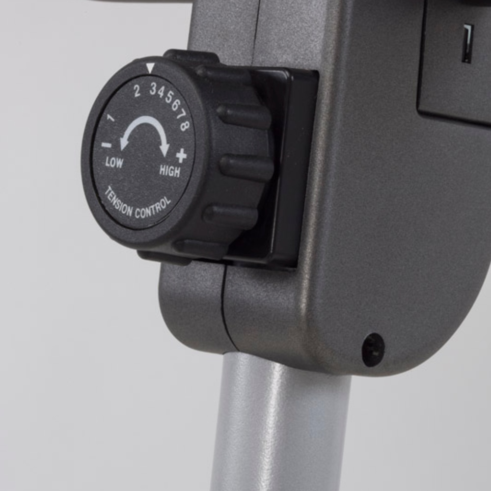 Sistema di frenaggio magnetico con regolazione manuale dello sforzo su 8 livelli. Massa volanica peso 6 kg. Peso massimo utilizzatore 100 Kg. HAND PULSE. SALVASPAZIO. Funzione voga.