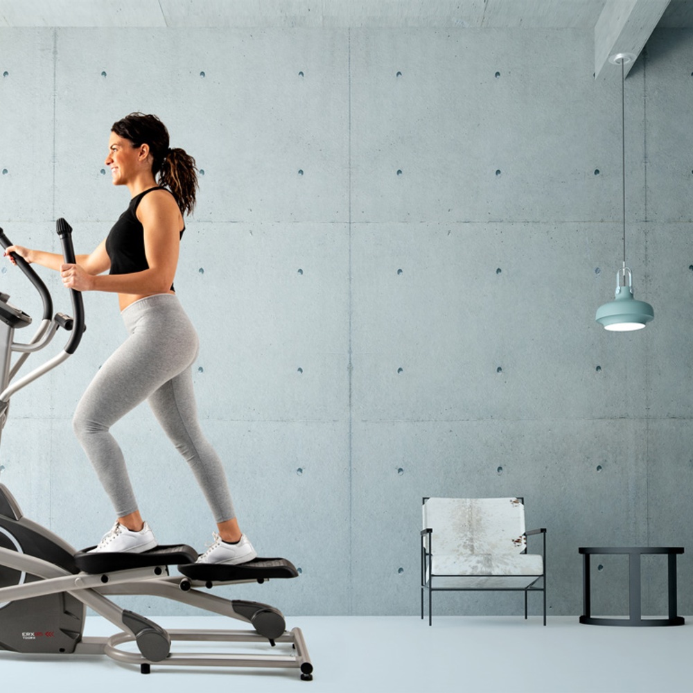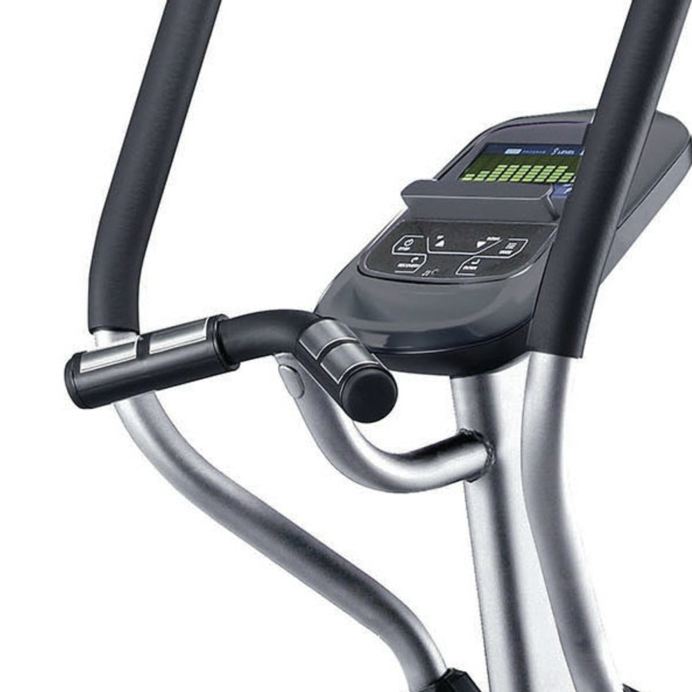 Sistema di frenaggio magnetico con regolazione elettronica dello sforzo su 24 livelli. Massa volanica peso 14 kg. Peso massimo utilizzatore 120 Kg. HRC-Heart Rate Control. Ricevitore Fascia Cardio. HAND PULSE. Audio Sound System.