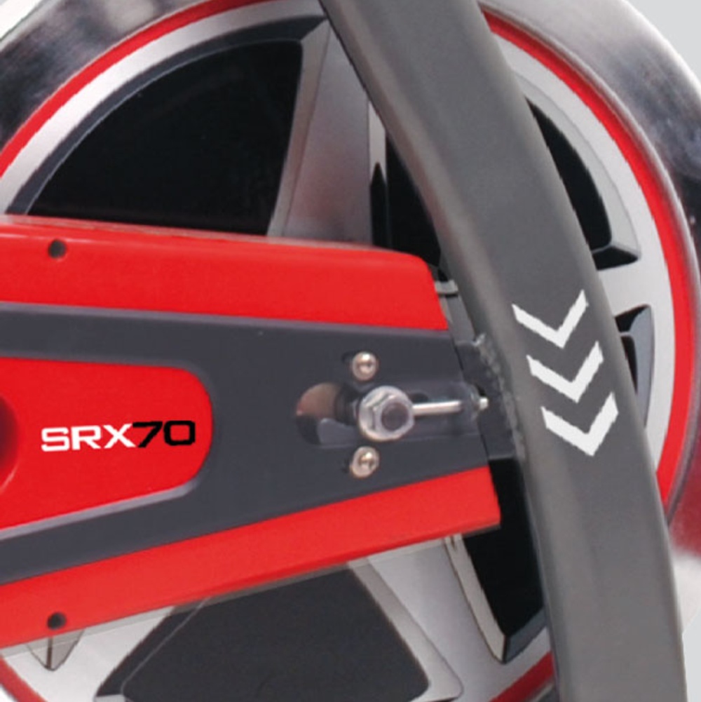 Trasmissione a cinghia con pignone fisso. Sistema di frenaggio a tampone con feltri. Dotato di leva di sicurezza per il bloccaggio rapido del volano. Massa volanica peso 22 kg (bilanciato) Ricevitore wireless per fascia cardio integrato.