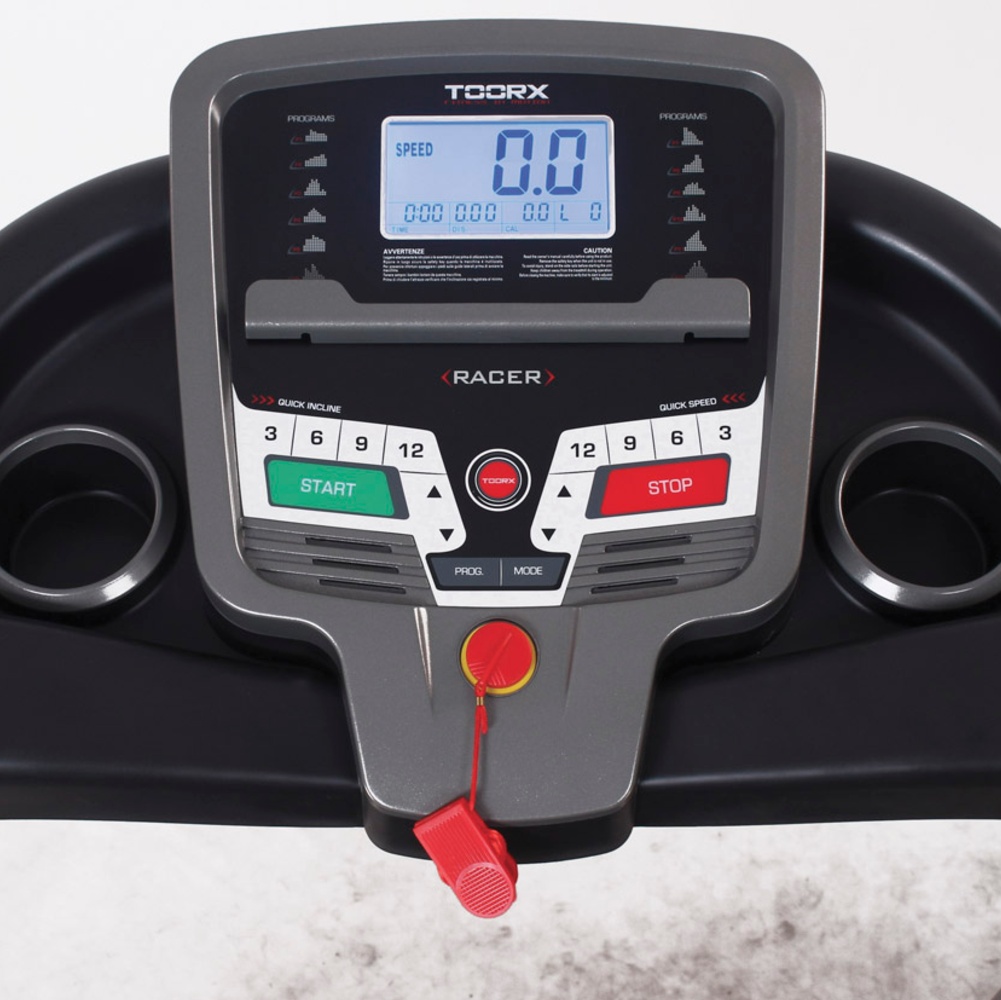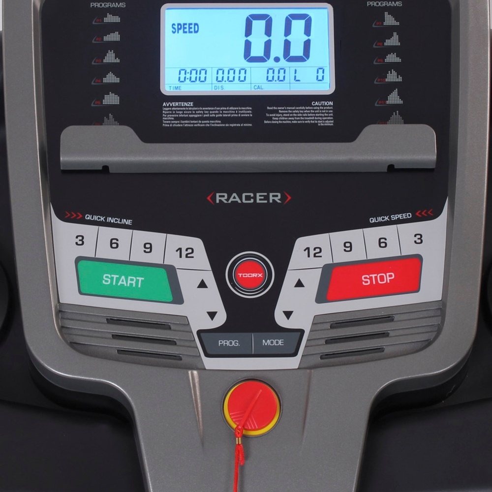 velocità, inclinazione, frequenza cardiaca, distanza, tempo, consumo calorico, programma in esecuzione |