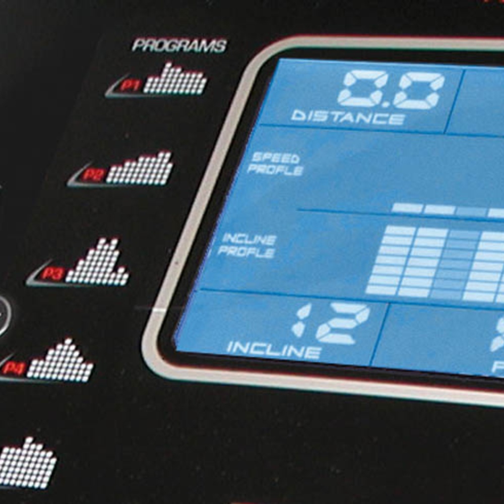 velocità - frequenza cardiaca - distanza - tempo - inclinazione - consumo calorico - profilo velocità e inclinazione - programma in esecuzione - lap 400 metri |