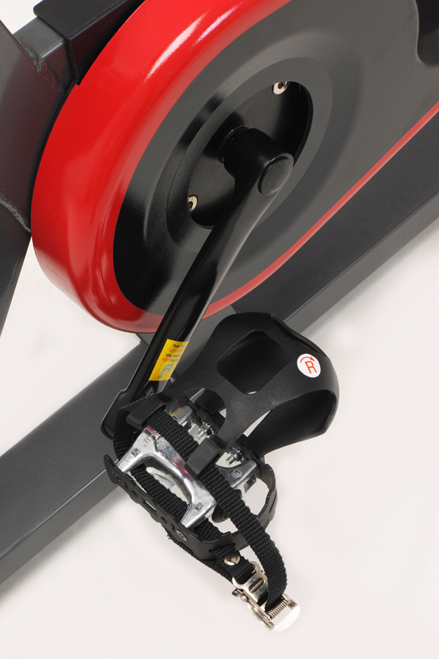 Transmissão por corrente com pinhão fixo. Sistema de travagem com sapatas de feltro. Equipado com alavanca de segurança para bloqueio rápido do volante. Massa do volante com peso de 20 kg (equilibrado). Hand pulse.